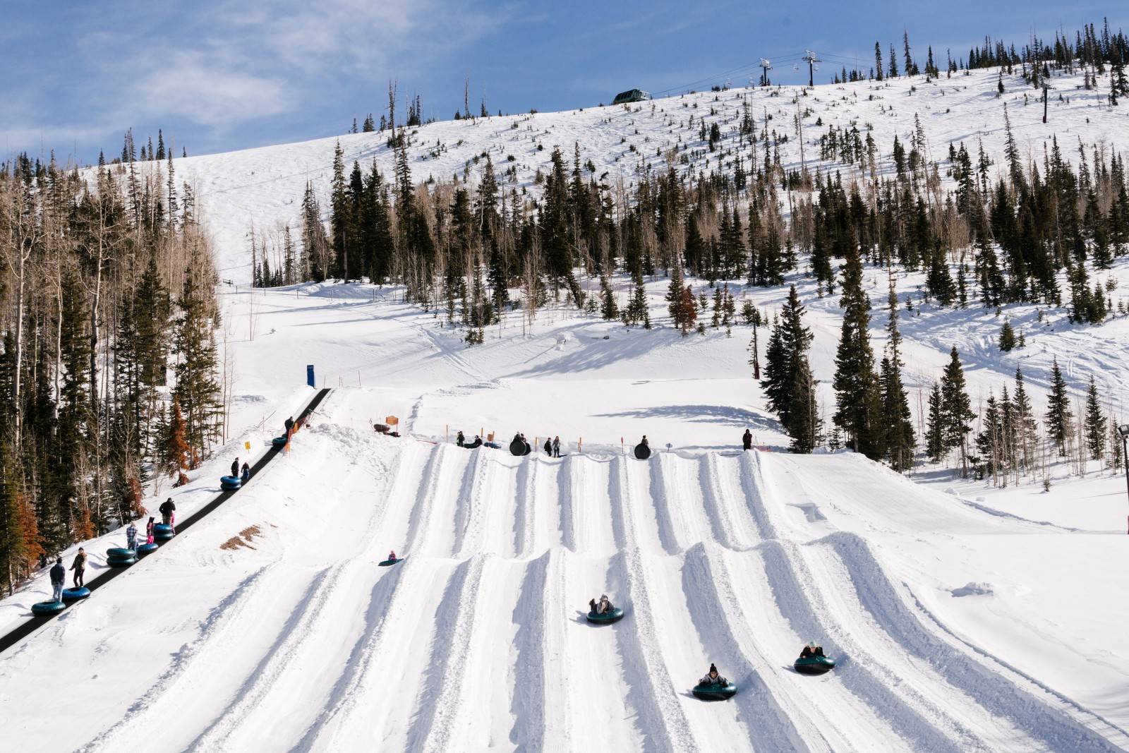 Two dedicated tubing parks operate at both giant steps and navajo mountains, featuring multiple lanes with varying lengths and pitches. Each park includes a snow tubing hill with a generous vertical drop, making it a family-friendly attraction for all ages. The tubing experience includes: