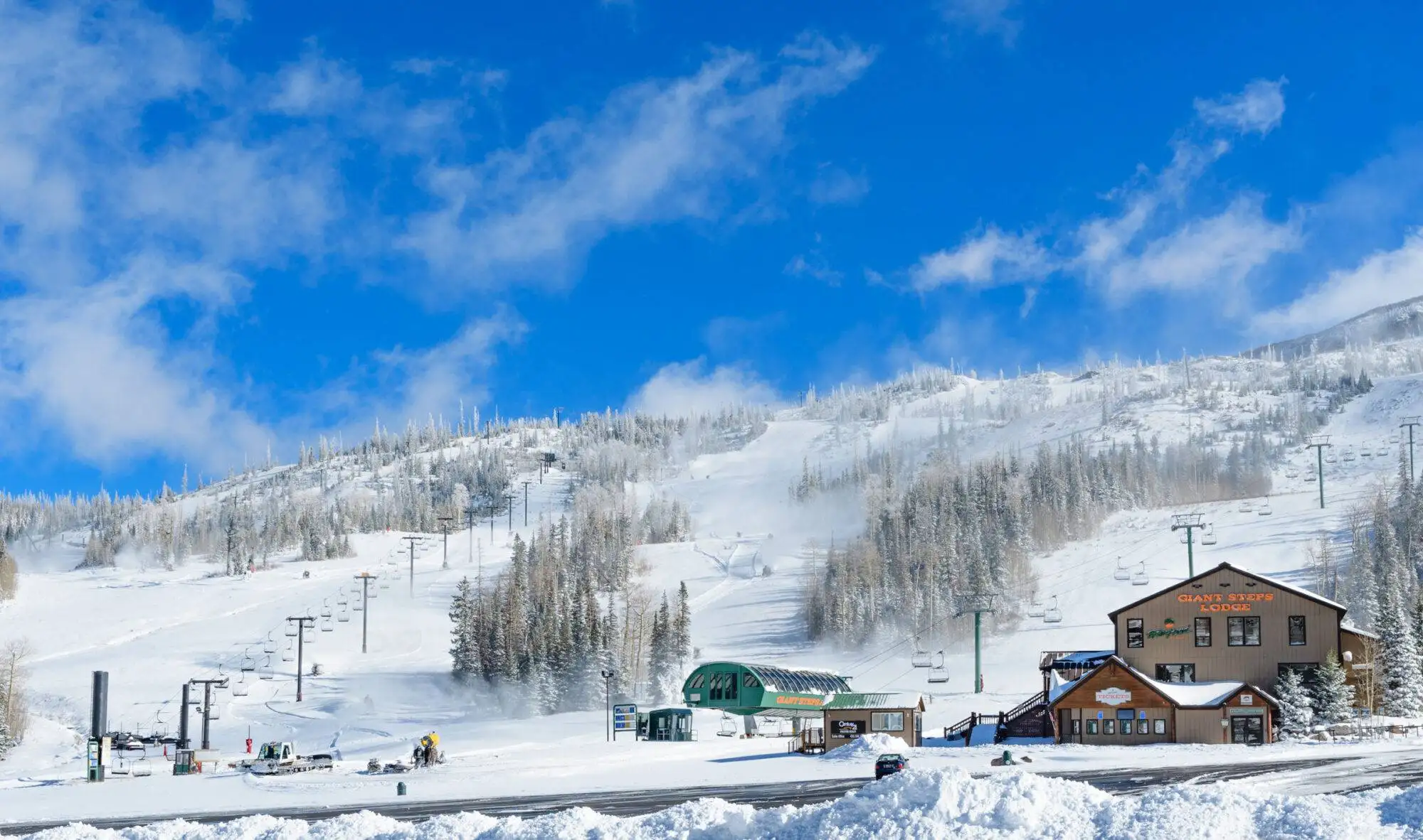 Giant Steps serves as the resort’s primary mountain, featuring steeper intermediate terrain and most of the resort’s advanced runs. This side typically attracts more experienced skiers and snowboarders seeking challenging descents and varied terrain features.